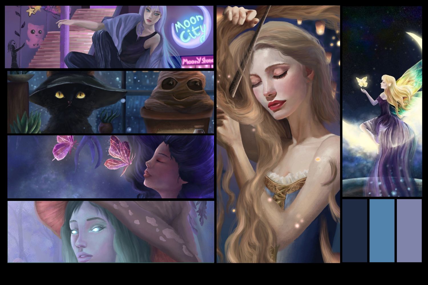 Mon processus de création débute par la recherche d’images inspirantes. Ensuite, je sélectionne les éléments qui me semblent les plus pertinents pour créer une composition originale. Que ce soit à l’acrylique, à l’aquarelle, au graphite ou sur tablette graphique avec Procreate, je m’attache à retranscrire la beauté et la poésie qui émanent de mes sources d’inspiration.